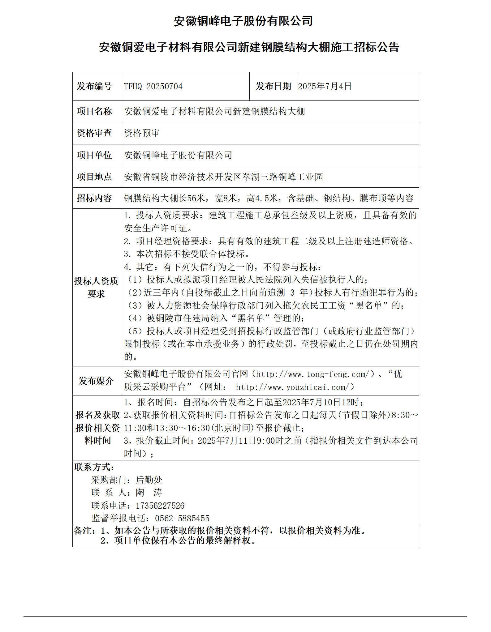太阳成城集团tyc234cc古天乐 (安徽铜爱电子材料有限公司新建钢膜结构大棚招标公告)_01