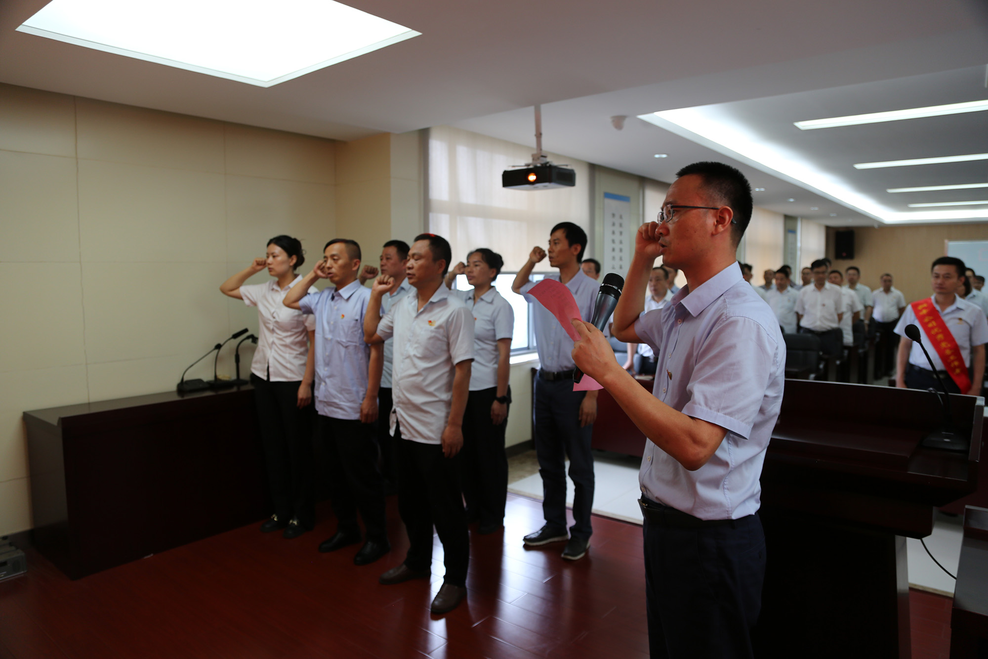 在首先进行的新党员入党宣誓仪式上,党委委员林政宣布新党员名单,欢迎新党员加入党组织并向他们提出希望和要求。随后,由党委委员何晓明领誓,新党员进行入党宣誓。在“两优一先”表彰环节,公司党委领导为受表彰对象颁发荣誉证书,“两优一先”代表分别作先进事迹报告。
